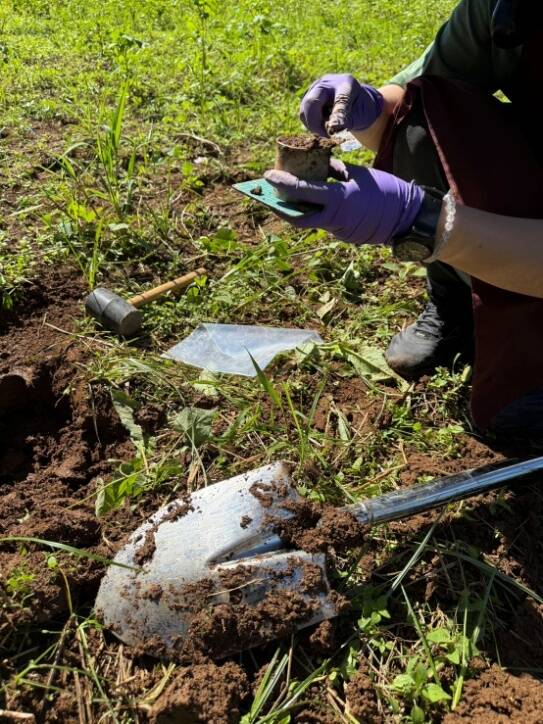 農業部種苗改良繁殖場建構「農田增匯示範區」,在綠肥種植區域土壤取樣,以長期追蹤土壤碳儲存量。(農業部提供)