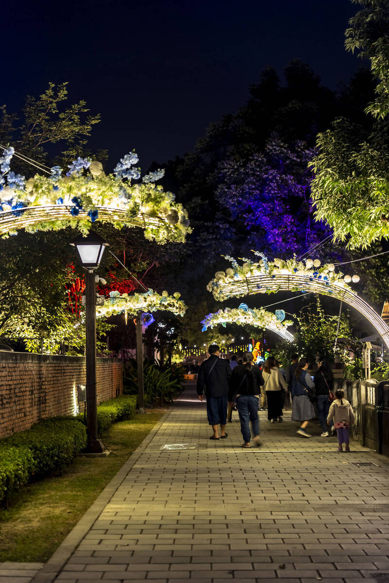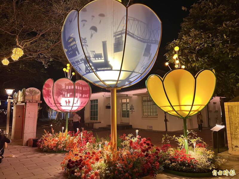 文化處表示,今年勝利星村燈區共規劃15組主題燈座,以花朵意象結合層層光影鋪陳,讓入夜後的園區在燈光與花藝交織下綻放迷人風貌。將軍之屋前的「記憶之花」以巨型花朵造型呈現,夜間透過光影層層綻放,詮釋記憶中風華年代的美好意象;「花之路」則以繁花構築成花隧道,象徵幸福與祝福,引領民眾彷彿走入奇幻花境。