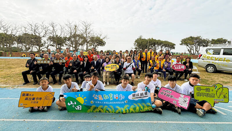 榮成紙業與榮成山與田教育基金會,舉行「交通車捐贈暨單車環島授旗儀式」(榮成紙業提供)