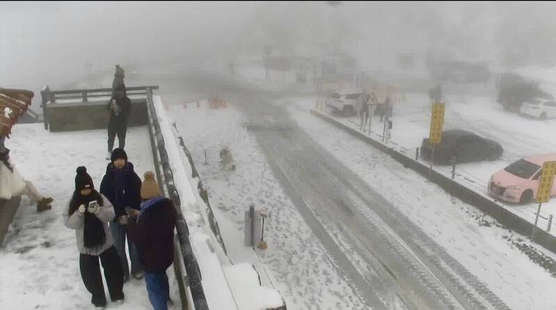 武嶺亭一早就有追雪遊客上來拍照。(圖擷自公路局合歡山即時影像)