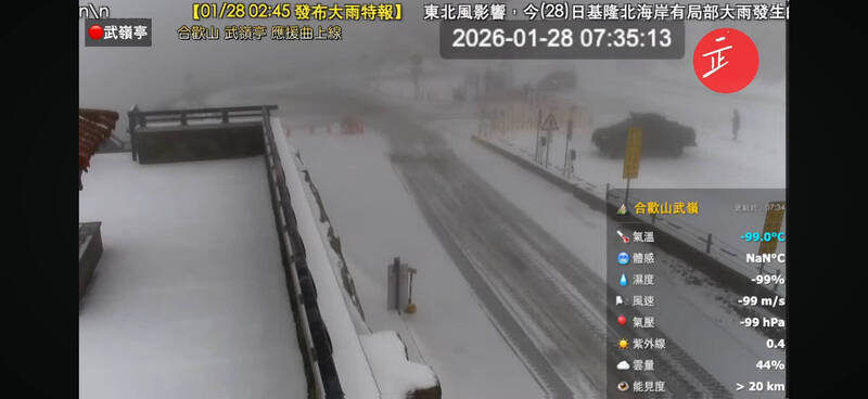 冷氣團南下夾帶水氣,合歡山昨晚開始下冰霰,接著飄雪!經一夜降雪,山上呈現冰雪世界,上午7點恢復交通後,追雪客衝上山捕捉美麗雪景,公路局提醒,台14甲線鳶峰到大禹嶺要加掛雪鏈。有網友緊盯YouTube武嶺即時影像,發現好幾次氣溫竟顯示「-99度C」,笑稱「溫度計也凍僵秀逗了」。