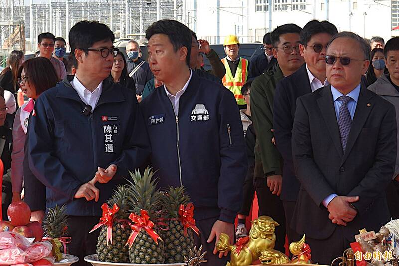 交通部長陳世凱(左一)今天到高雄參加高鐵公司左營基地第二檢修廠上梁典禮,並與高雄市長陳其邁、高鐵董事長史哲多次交談。(記者吳亮儀攝)