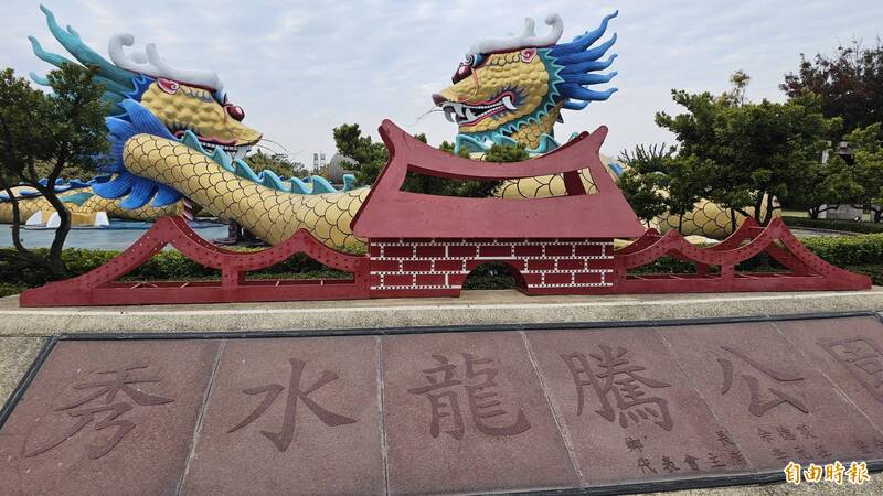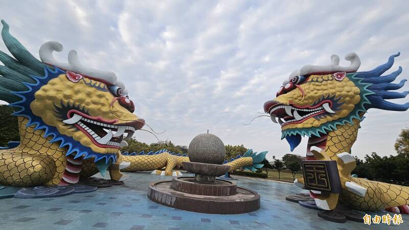 彰化縣秀水鄉龍騰公園是全鄉最大的空間,兩條金色巨龍是地標。(記者劉曉欣攝)