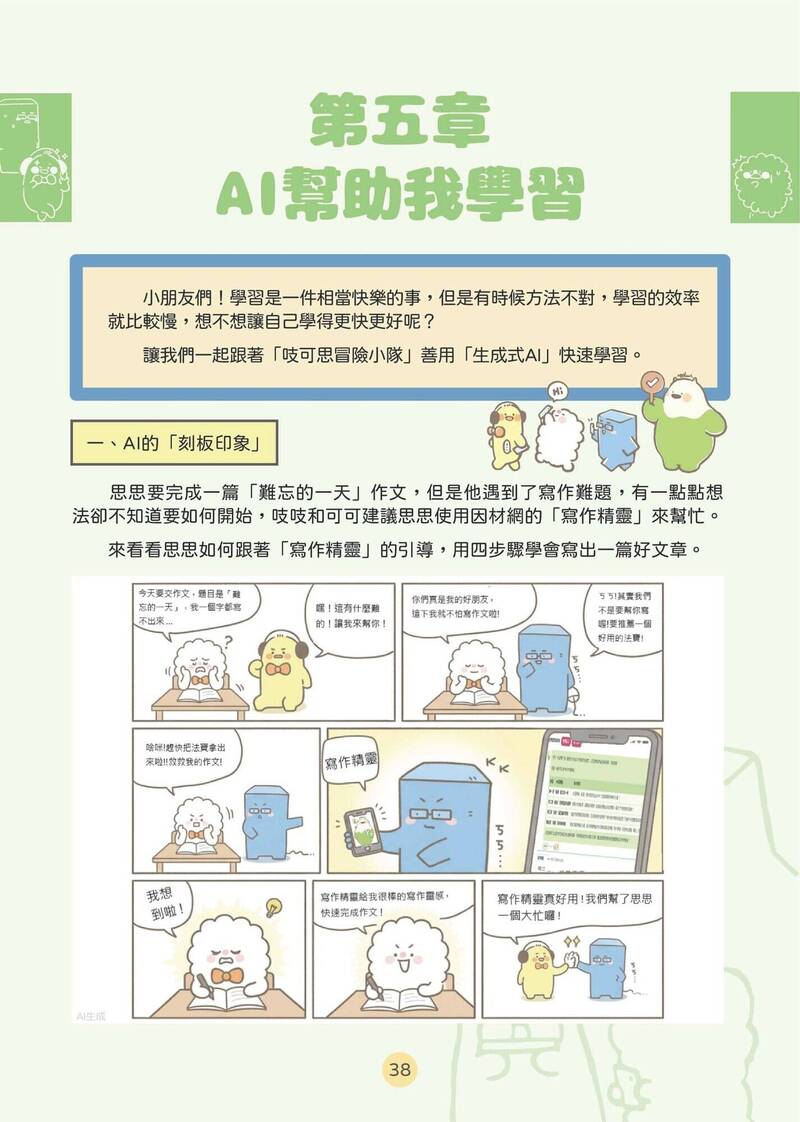 教育部資科司科長鄧慧穎說明,「我和AI一起學」是1本充滿插畫與任務的冒險讀本,從生活情境出發,引導孩子實際操作生成式AI,學習如何提問、如何在國語、自然、社會等學科中善用AI協助理解與整理,書中也提醒孩子,思考與創意始終來自於自己,而AI是學習的好幫手,透過引導式問題與自我檢核,孩子學會修正、判斷與再創作,培養主動學習的能力。