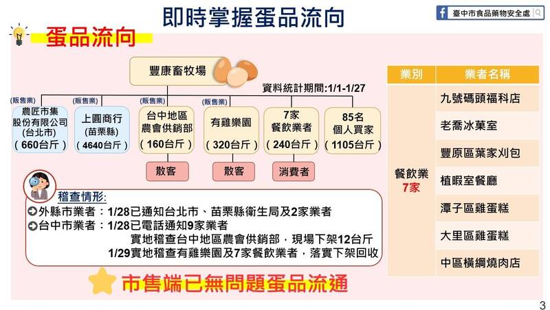 至於流至台中地區的蛋品也已掌握去向,曾梓展指出,包括160台斤提供農會供銷部販售給散客、320台斤提供「有雞樂園」販售給散客,240台斤分別販售給「九號碼頭福科店」、「老喬冰菓室」、豐原區的「葉家刈包」、「植暇室餐廳」、位於潭子區及大里區的雞蛋糕及中區「橫綱燒肉店」等7家餐飲業者;另有1105台斤販售給85名個人買家。
