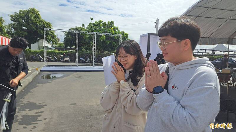 台東縣議員周達三的女兒與女婿今天祈求明天歸寧宴不要下雨。(記者黃明堂攝)