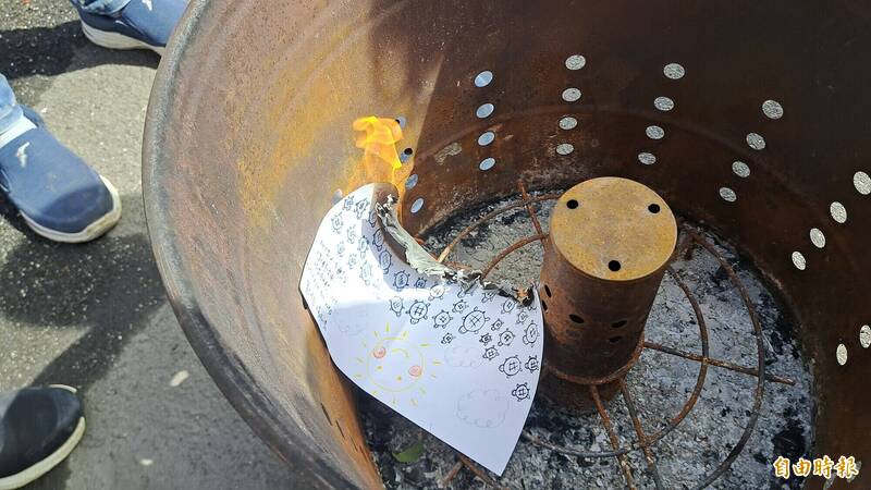 台東縣議員周達三的女兒與女婿今天畫烏龜後焚燒,祈求明天歸寧宴不要下雨。(記者黃明堂攝)
