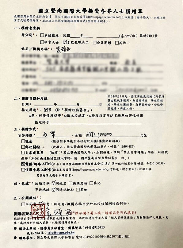 袁頌西校長親筆簽署的「暨大接受各界人士捐贈單」。(國立暨大提供)