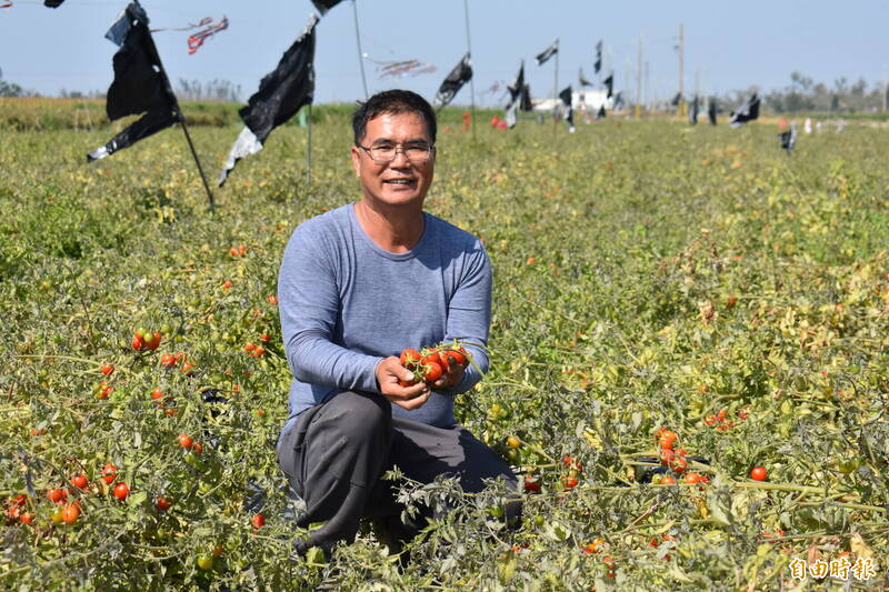 台南鹽水小番茄正值盛產,果農吳坤值和家人每天都要趕鳥,小番茄田也插滿布條嚇走八哥鳥,但效果有限。(記者楊金城攝)