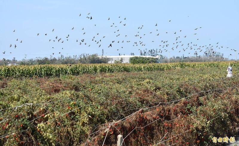 台南鹽水小番茄是八哥鳥最愛,這塊小番茄田上空就有200多隻八哥鳥。(記者楊金城攝)