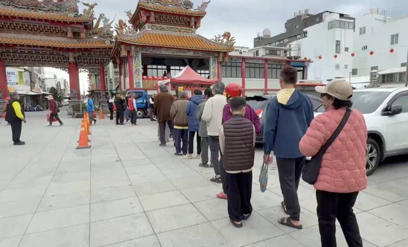 台東天后宮今早舉行寒冬送暖活動,廟方籌措600份生活用品物資供低收民眾使用,住在廟附近的對象大多親自前來索取,有的坐著身障車前來或獨居老人則是步行抵達,較遠者,則由里長開車載送並挨家發放。
