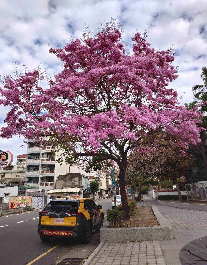 彰化市南校街的洋紅風鈴木「炸裂」,粉紫色如棉花糖。(米諾斯提供)