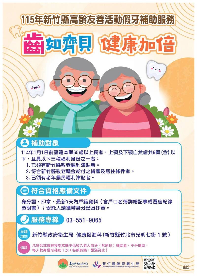新竹縣政府今年度推動「高齡友善長者裝置活動假牙補助實施計畫」,協助缺牙長者重建口腔功能、改善營養攝取,並減輕長者及家庭的經濟負擔;衛生局表示,補助內容包含口腔篩檢、口腔檢查評估及全口活動假牙裝置等服務,符合資格者最高可獲6萬元假牙補助。