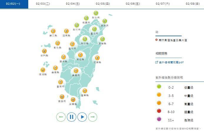 紫外線指數方面,週一新竹以北地區為「低量級」,其餘縣市則皆為「中量級」。
