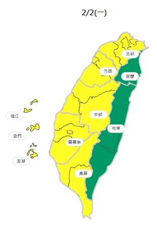 空氣品質方面,週一受大陸冷氣團影響,環境風場為東北風,午後東北風可能挾帶微量境外污染物移入影響臺灣及離島,中南部位於下風處,污染物稍易累積;宜蘭、花東空品區為「良好」等級;北部、竹苗、中部、雲嘉南、高屏空品區及馬祖、金門、澎湖為「普通」等級。