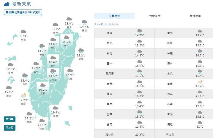 降雨方面,週一基隆北海岸、大臺北山區及東北部地區有短暫雨,桃園以北、花東地區、恆春半島及中部山區有局部短暫雨,新竹以南地區一早仍有局部短暫雨,逐漸轉變為多雲的天氣,此外,若凌晨溫度與水氣條件配合,3000公尺以上高山有零星降雪機率,前往高山請留意道路結冰及路面濕滑情形。