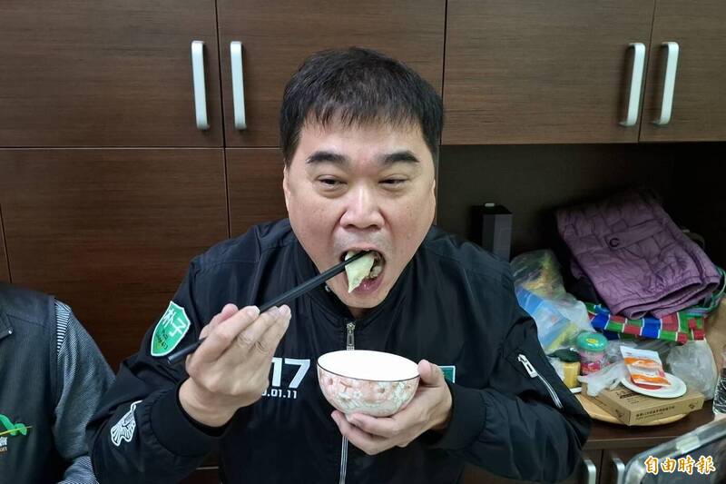 朴子市農會總幹市田志強稱讚高麗菜水餃好吃。(記者林宜樟攝)