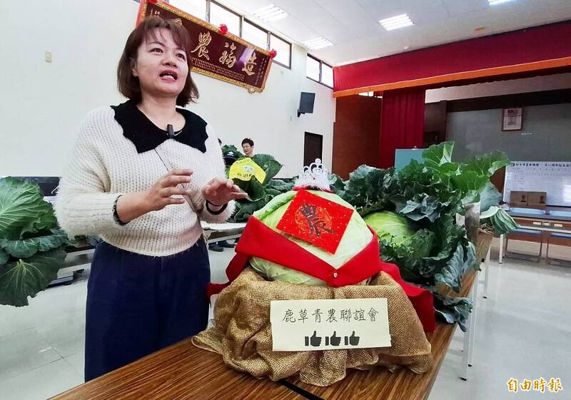 鹿草青農陳惠茹還為高麗菜做創意裝扮。(記者林宜樟攝)