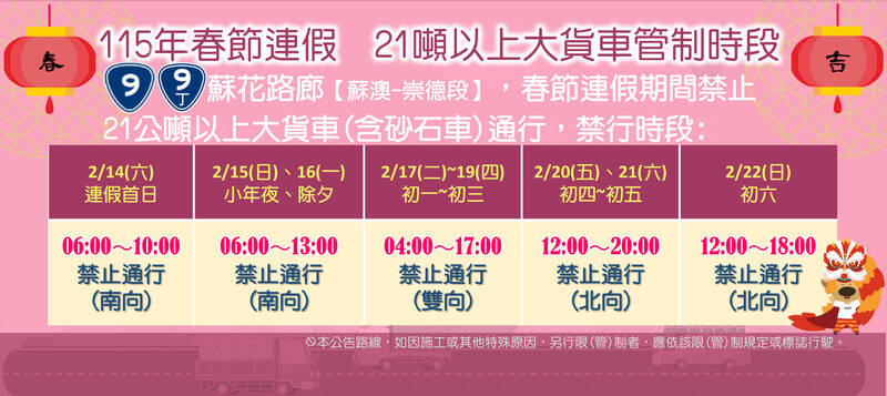 高公局鼓勵用路人於離峰時段利用高速公路;省道部分,春節及和平紀念日連假期間每日特定時段,台9線蘇花路廊將禁止載運危險物品車輛及21噸(含)以上大貨車通行,同時段並實施大客車優先措施。