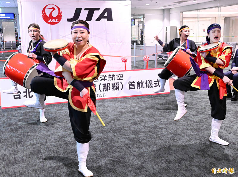 日本越洋航空今天開航台北-沖繩航線,越洋航空特別舉辦開航儀式,安沖繩太鼓表演,慶賀新航線開航。(記者朱沛雄攝)