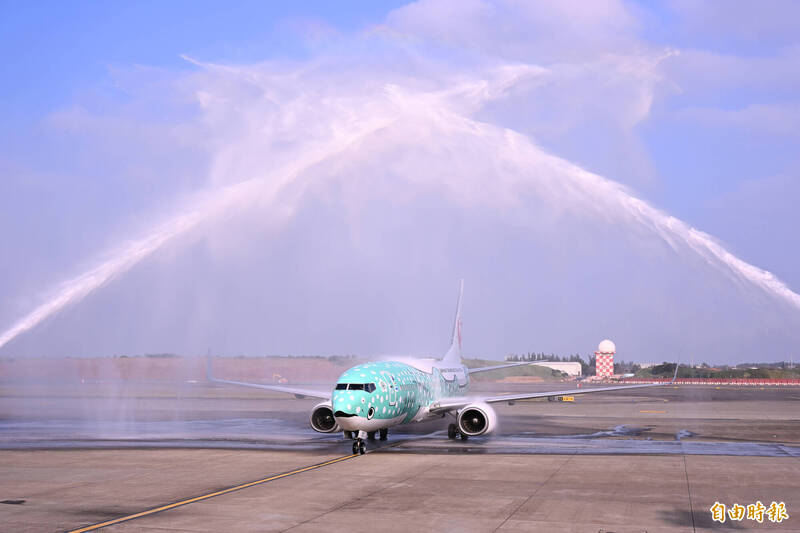 日本越洋航空今天開航台北-沖繩航線,這也是越洋航空成立以來,首度跨足國際航線。首航班機以全新塗裝完成的綠色鯨鯊彩繪機執飛,越洋航空特別舉辦開航儀式,安排水門禮慶賀新航線開航。(記者朱沛雄攝)