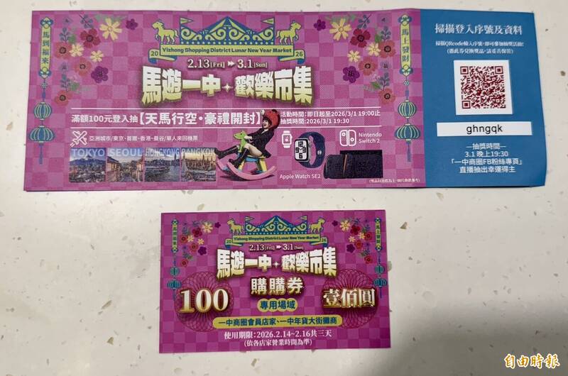 一中商圈年貨大街開幕推出50元購買百元馬年購購券紅包,等同100元現金使用。(記者蔡淑媛攝)