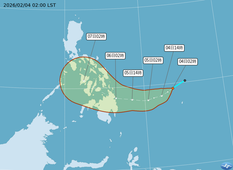 中央氣象署稱,熱帶性低氣壓TD02目前位於菲律賓東南方海面,未來朝西往菲律賓南部移動,有發展為輕颱的趨勢。(圖擷自中央氣象署網站)