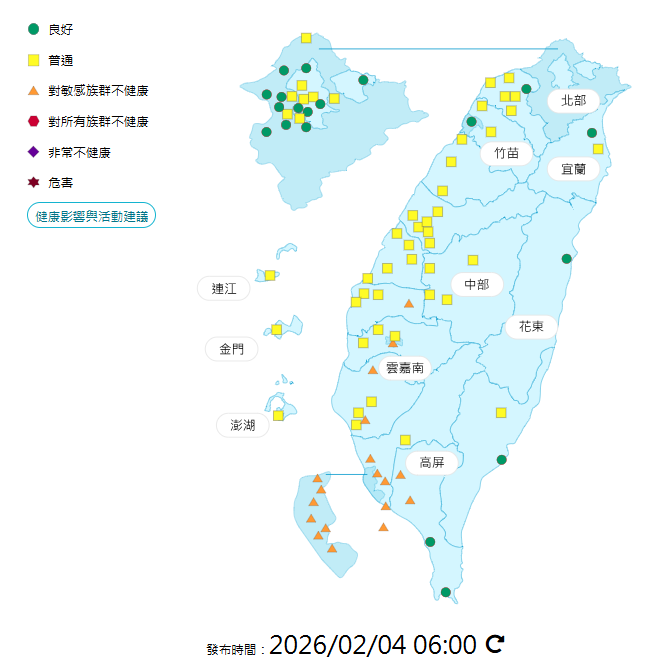 空氣品質方面,宜蘭、花東空品區為「良好」等級;北部、竹苗、中部空品區及馬祖、澎湖為「普通」等級;雲嘉南、高屏空品區及金門為「橘色提醒」等級。