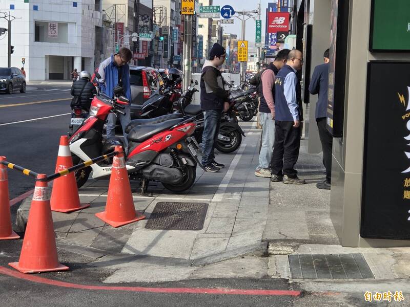 嘉義市環保局上午稽查店家前水溝,進一步蒐證調查。(記者王善嬿攝)