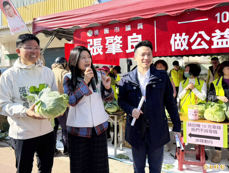 民進黨桃園市議員張肇良(左1)邀總統府副秘書長何志偉(右1)、議員魏筠(中)到場響應義賣10元高麗菜。(記者李容萍攝)