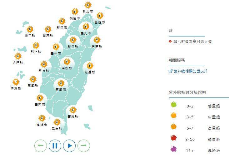 紫外線指數方面,台中市、彰化縣、花蓮縣為中量級,其他縣市為高量級。(擷取自中央氣象署網站)