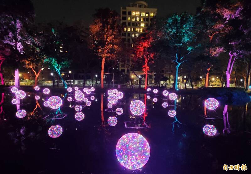 還有不規則ㄇ字型打造彩虹光影隧道、彩色燈飾佈設長40公尺星光大道迎賓;公園草地打造大型發光棒棒糖,搭配散落一地發光球,民眾搶拍打卡超夯。