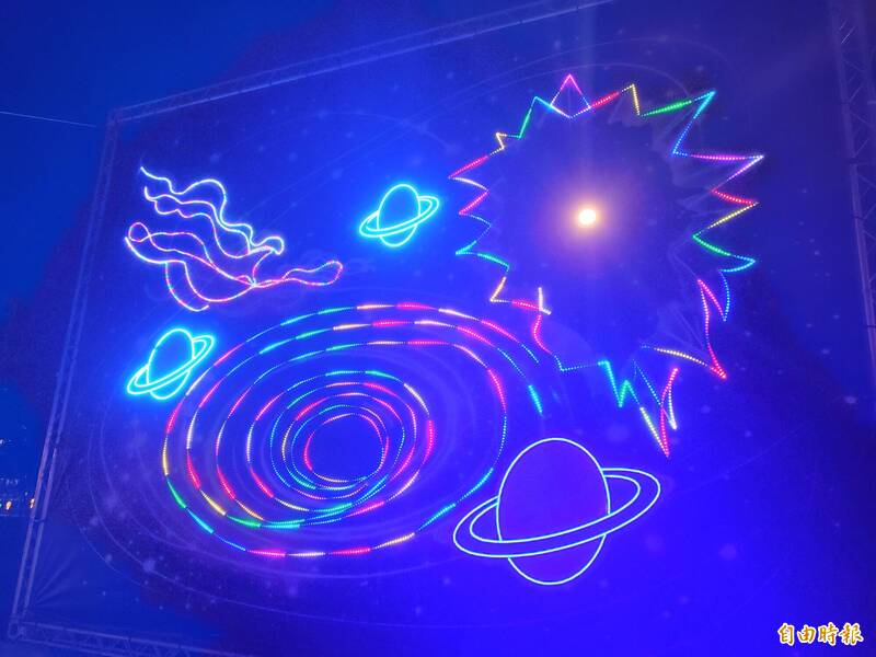 鳳山光之季以七彩LED燈條,利用光的交錯與擴散,夜幕下勾勒出星際宇宙,象徵迎接璀璨未來。(記者陳文嬋攝)