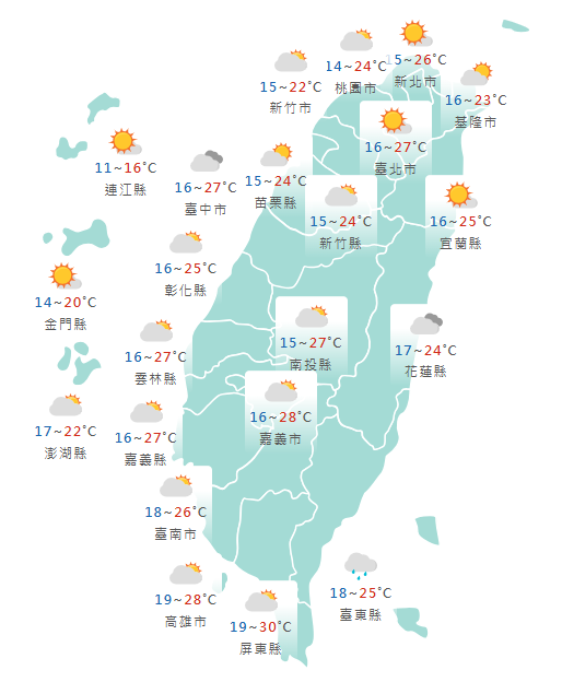 | 各地體感溫度預報 (°C) | 北部 | 中部 | 南部 | 東部 |