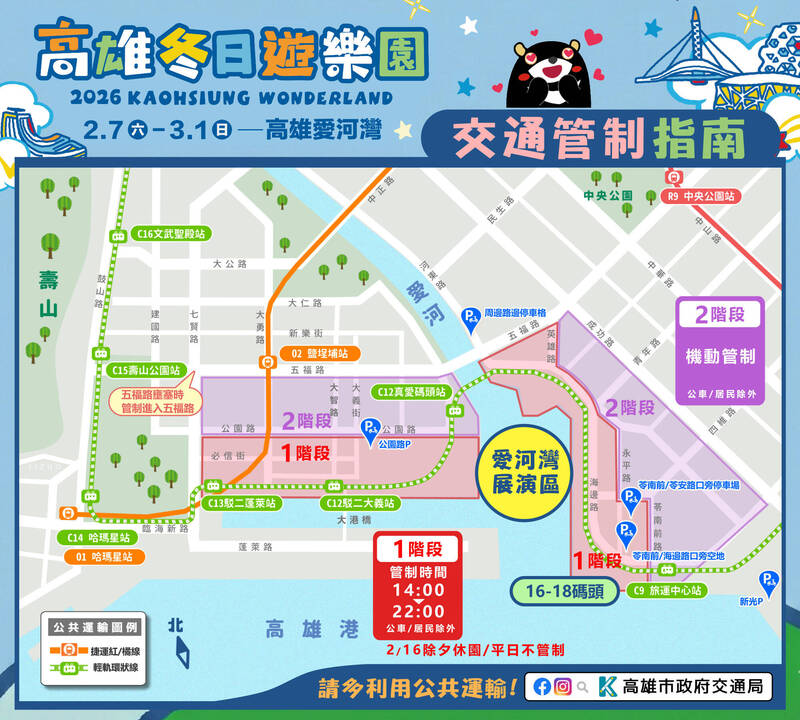 春節連假(除2月16日除夕外)及例假日,愛河灣周邊將分階段實施交通管制,第一階段為每日下午2點至晚上10點,管制範圍包含愛河灣西側(公園路以南、七賢路以東道路)、愛河灣東側(五福路以南、四維路以南、英雄路以西、永平路以西、苓南前路以西)等區內道路管制通行。