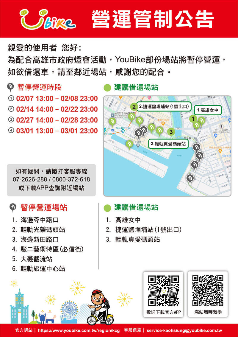 活動期間,會場周邊部分YouBike站將暫停營運。(高雄市交通局提供)