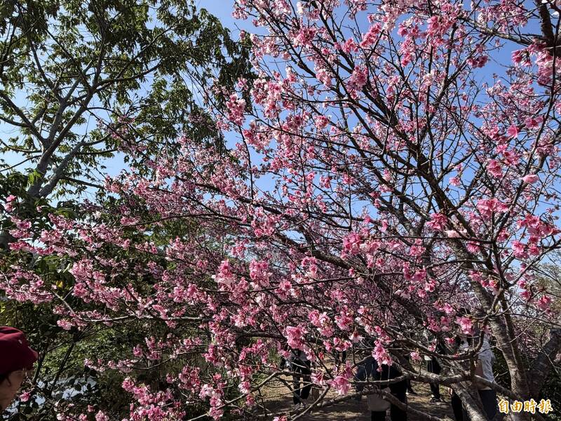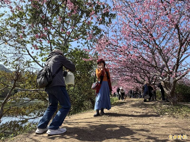 春暖花開,新竹縣關西櫻花秘境、坪林國小附近的池畔櫻花林,連日來吸引許多遊客專程來賞櫻。(記者廖雪茹攝)