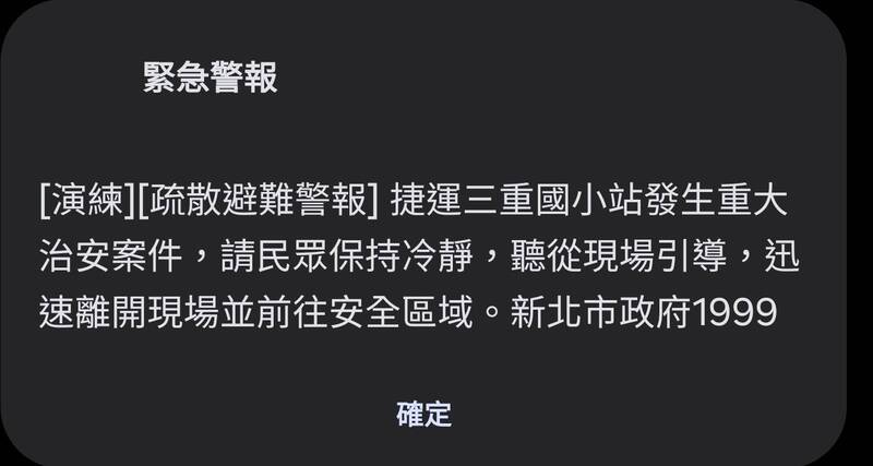 為強化台北捷運公司應對突發危安事件的緊急應變能力,雙北市府今(5日)下午於中和新蘆線的三重國小站至大橋頭站區間,展開危安攻擊模擬演練,不過細胞簡訊發布時並未註明演練,許多民眾收到後嚇壞,紛紛上網詢問,網罵翻為什麼不註明演練是演練。