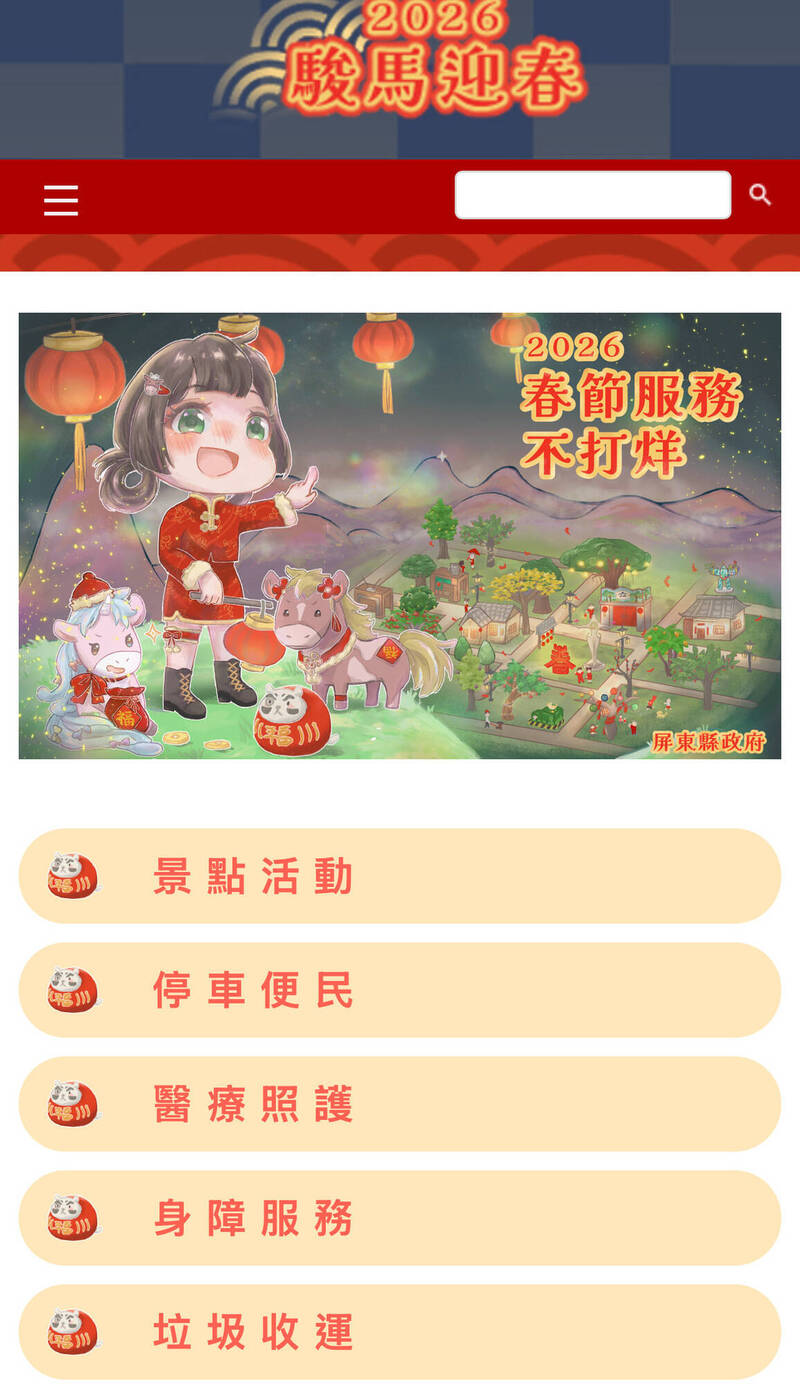 屏東縣政府全球資訊網「2026春節服務不打烊專區」提供各項服務資訊。(記者羅欣貞翻攝)