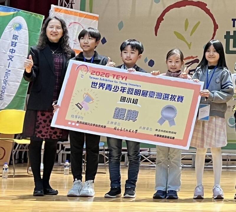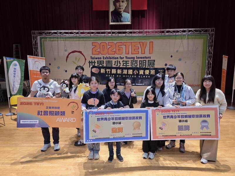 新竹縣新湖國小團隊參加2026年 IEYI 世界青少年發明展暨台灣選拔賽,轟出「全壘打」!4件作品分別榮獲1金、1銀、2佳作及企業特別獎。(新湖國小提供)