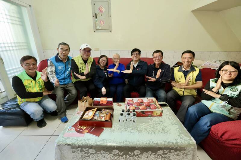 陳其邁一行人與獨居阿嬤比超人力霸王招牌手勢。(高市社會局提供)
