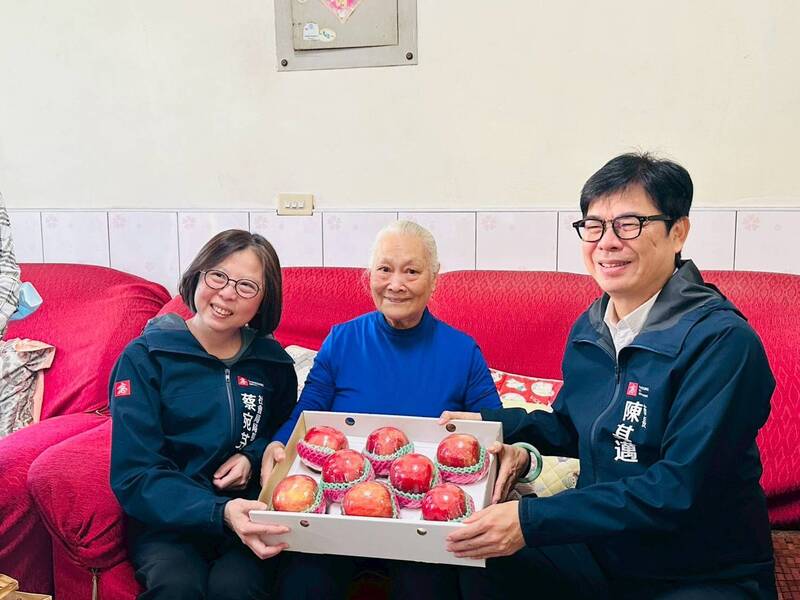長輩開心收下市長陳其邁贈送蘋果禮盒,並邀請市長一起品嚐。(高市社會局提供)
