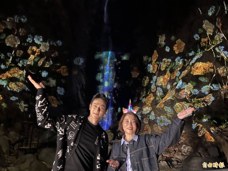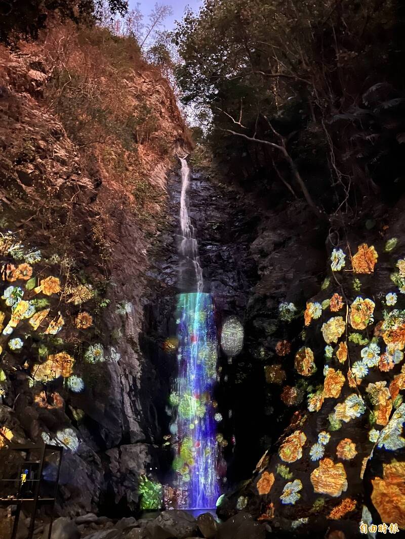 「奇幻大津」瀑布投影展演,瀑布化身為動態畫布,百花盛開,蝴蝶飛舞。(記者羅欣貞攝)