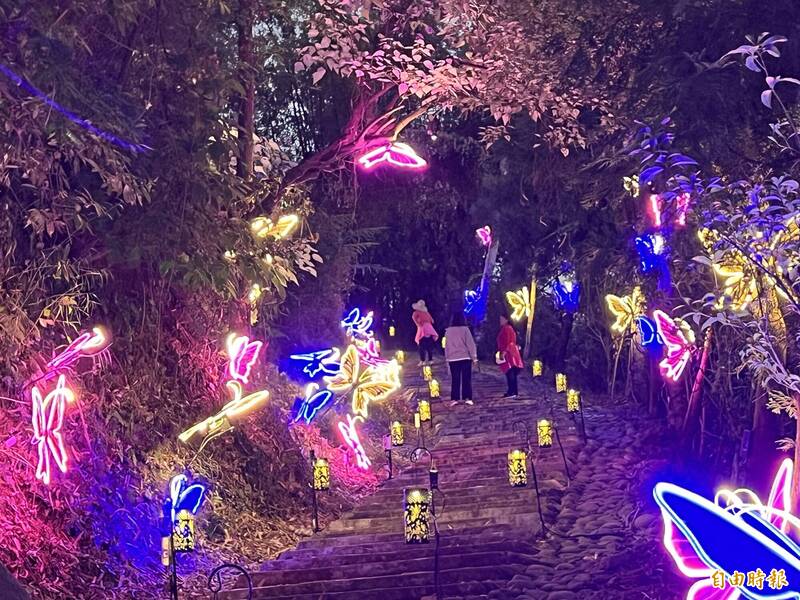 漫步「蝶舞山林」燈飾間,宛如被起舞的蝴蝶包圍,相當夢幻。(記者羅欣貞攝)