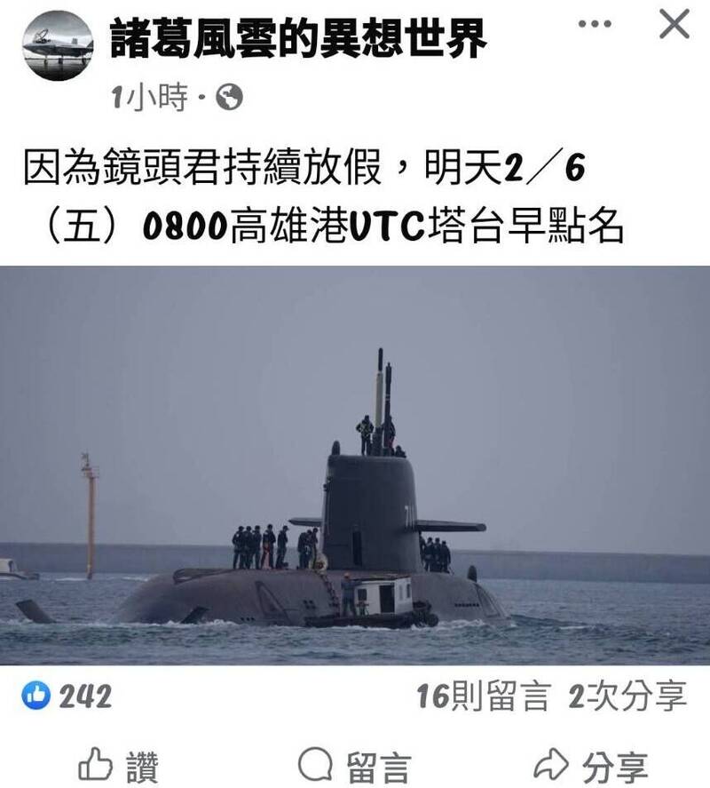 不過,由於直播畫面遲遲沒有恢復正常運作,臉書粉專「諸葛風雲的異想世界」今晚發文表示,「因為鏡頭君持續放假,明天2/6(五)0800高雄港VTC塔台早點名」,似乎以此猜測海鯤號明天可能進行第4次潛航測試。