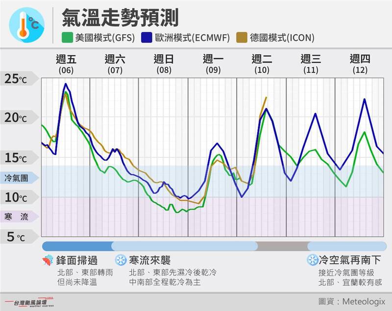 颱風論壇表示,週六至下週一寒流正式抵達,北部、東半部週六急遽降溫,整日濕冷或陰冷,最低溫將直探10度左右,預計週日白天才會漸漸轉為乾冷。中南部全程則以乾冷或陰冷為主,特別是深夜時段,低溫顯著,日夜溫差也會非常劇烈,單日震盪10度。