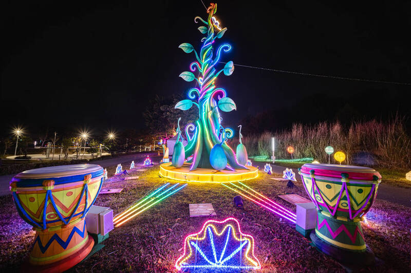 主燈「逐夢之樹」設有互動裝置,只要拍打鼓面等,就能「點亮童話」。(圖:市府提供)