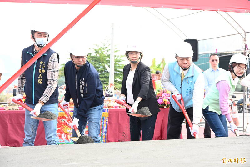 員林「石笱排水堤岸道路改善工程」,今日舉行動土儀式,縣長王惠美(左3)、員林市代理市長賴致富(右2)、大村鄉長賴志銘(左1)等人與會。(記者陳冠備攝)