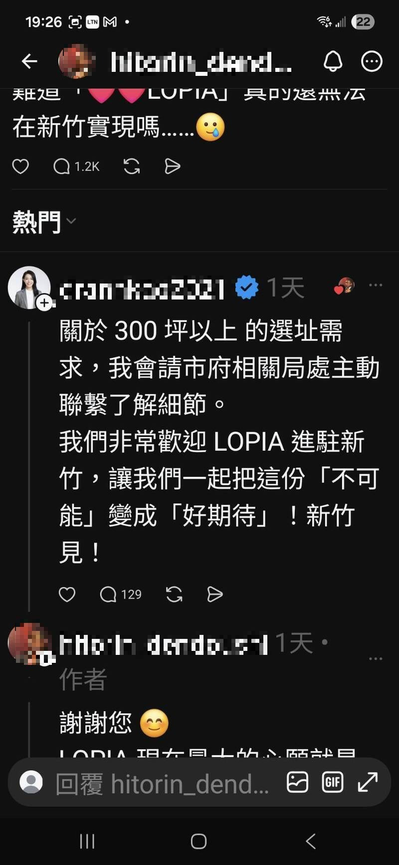 新竹市長高虹安也在貼文留言:「針對300坪以上的選址需求,將請市府相關局處主動聯繫了解細節,並強調非常歡迎LOPIA進駐新竹,讓我們一起把這份不可能變成好期待」;水元仁志也回覆高虹安:「進駐新竹是LOPIA目前最大的心願,也誠心希望能得到您的協助與支持,拜託您了」。