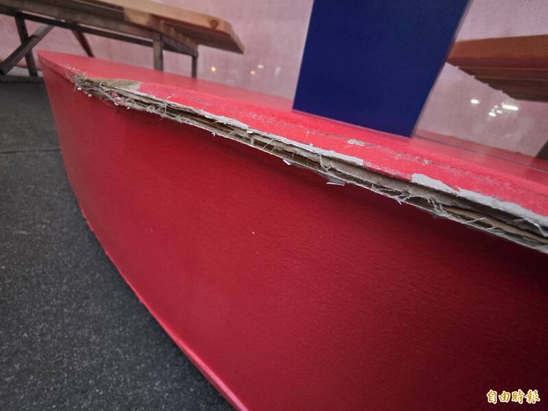 用瓦楞紙做的「小石花」底座,淋雨後又被風吹倒,馬上表皮磨損壞掉露出內部瓦楞紙。(記者花孟璟攝)